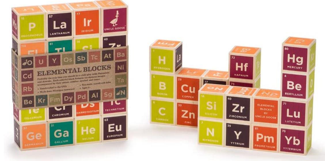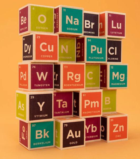 Probably the only time you should let a child play with Plutonium and Arsenic. Each colorful block in the Elemental Table Blocks set features six element images accompanied by their atomic number, symbol, and name. Mad scientists of all ages love these blocks. The vibrant and vivid colors capture the eye and excite imaginations. Adults claim to get these blocks for children...but often get sets for themselves. Who can blame them? Periodic Table Blocks make for a colorful display, but are also fun for playing, learning, and advancing scientific discussions.