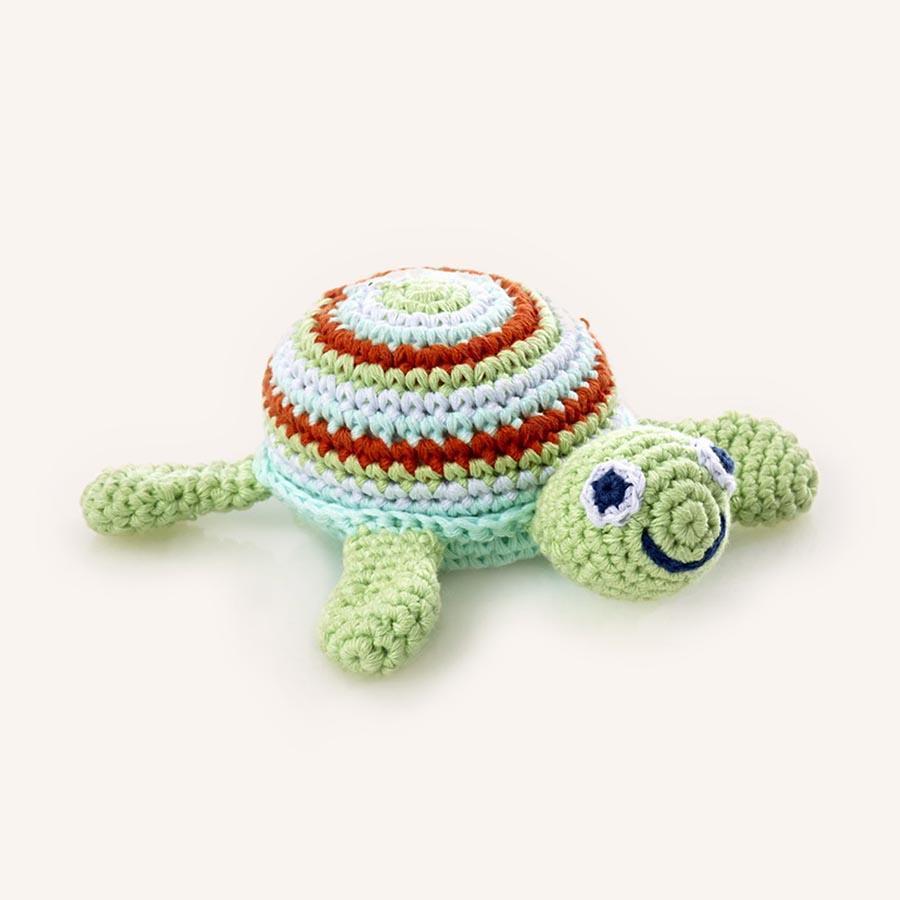 This turquoise turtle rattle can’t fail to delight. 100% cotton yarn, in pretty pastel shades and with a bright flash of red, its smiling face is sure to hold your baby’s attention.